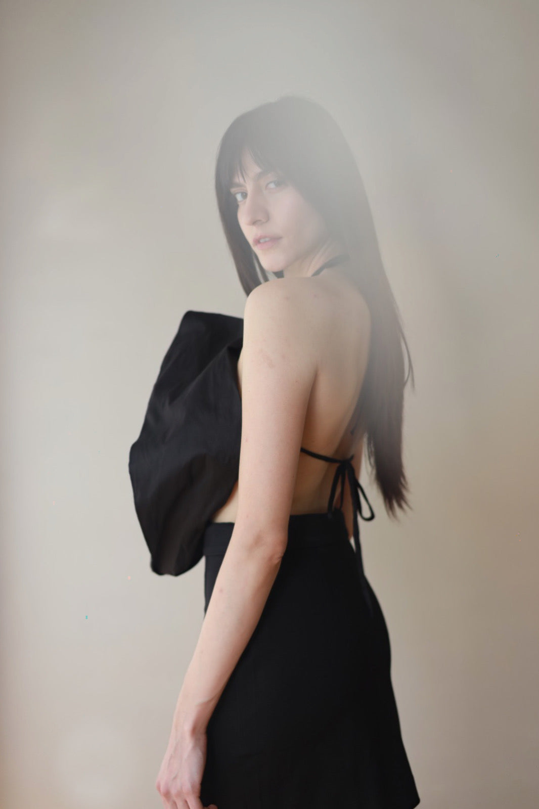 Convierte cualquier look en una obra de arte con nuestro Top Rose. Encontrarás un top negro halter en forma de flor que se ajusta al cuerpo y le brindará una apariencia sofisticada.